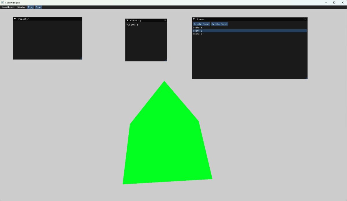 Le moteur inclut un système de gestion de scènes permettant de créer et organiser différents environnements de jeu. Ce système facilite la gestion des niveaux ou des espaces du jeu et permet de charger ou supprimer facilement des scènes.